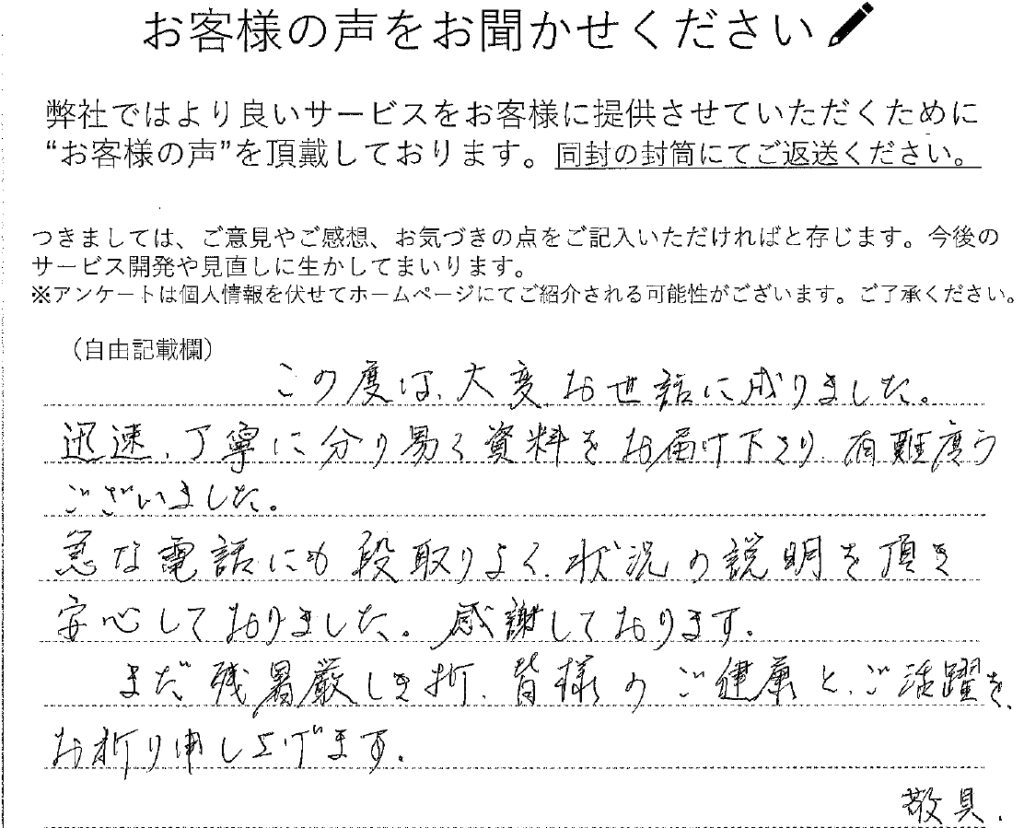 この度は、大変お世話に成りました。迅速、丁寧に分り易く資料をお届け下さり、有難度うございました。