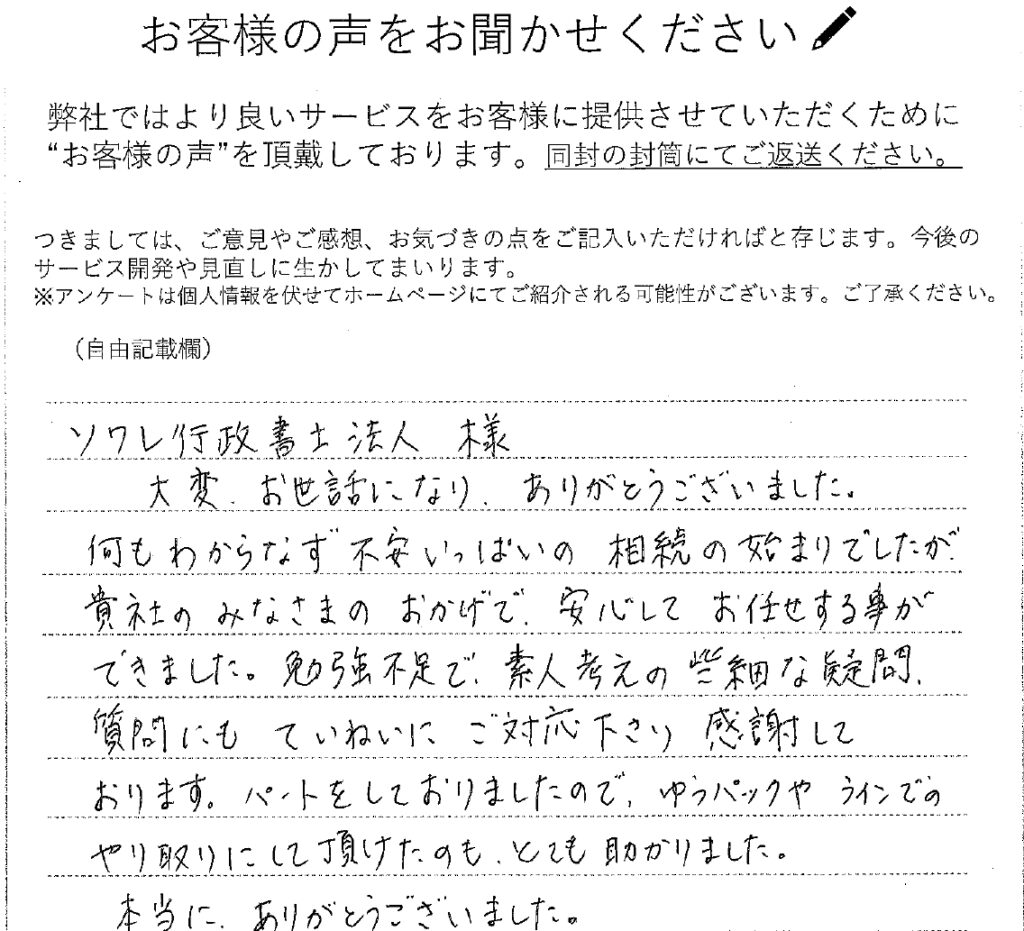 大変、お世話になり、ありがとうございました。何もわからなず不安いっぱいの相続の始まりでしたが