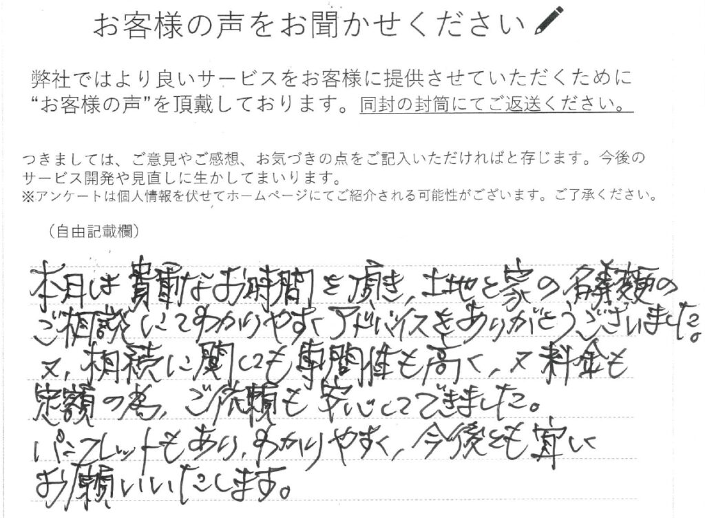 又、相続に関しても専門性も高く、又料金も定額の為、ご依頼も安心してできました。