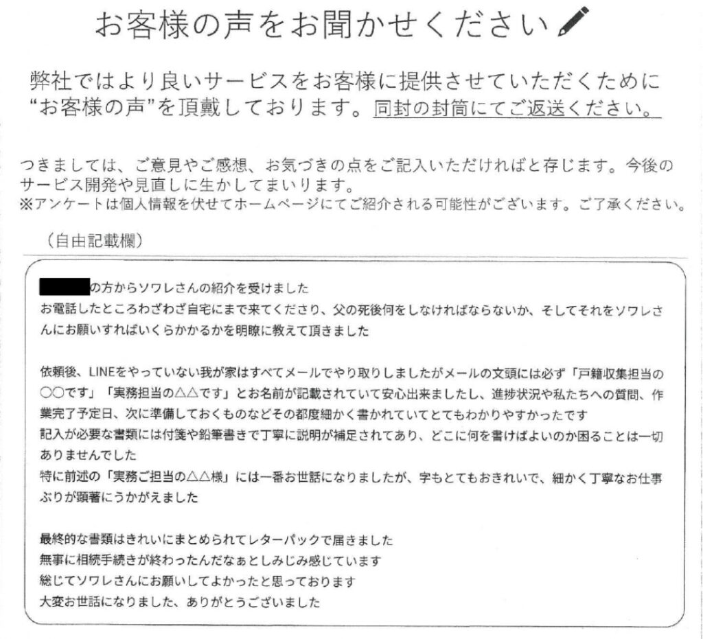 お電話したところわざわざ自宅にまで来てくださり、父の死後何をしなければならないか、そしてそれをソワレさ