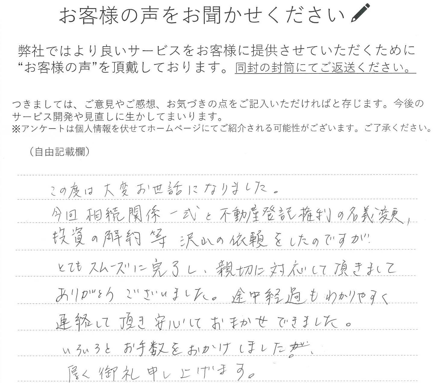 とてもスムーズに完了し、親切に対応して頂きまして