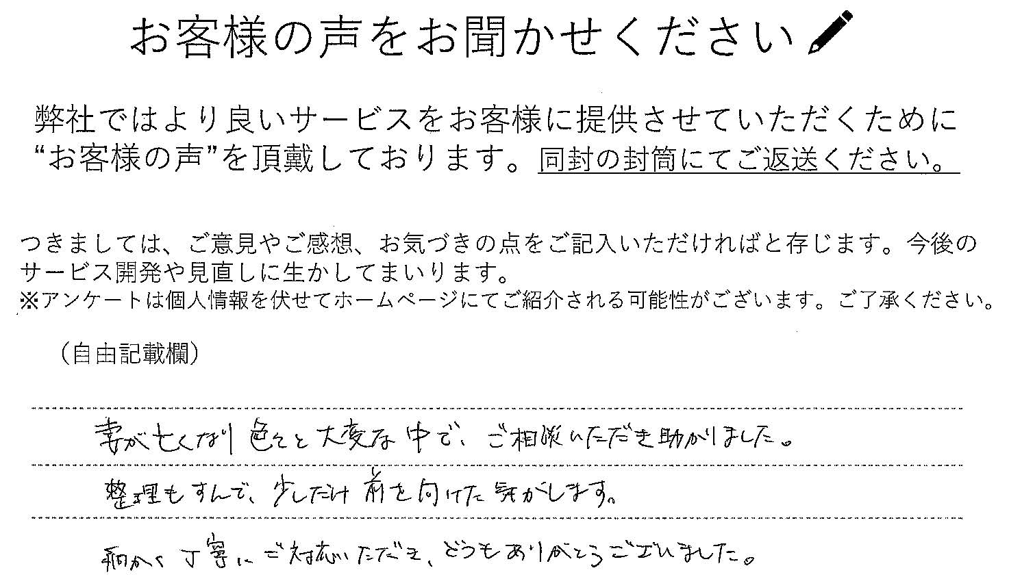お客様の声 お客様の声 No.328 2026.03.07 妻が亡くなり色々と大変な中で、ご相談いただき助かりました。 整理もすんで、少しだけ前を向けた気がします。 細かく丁寧にご対応いただき、どうもありがとうございました。 お客様の声 No.327 前の記事