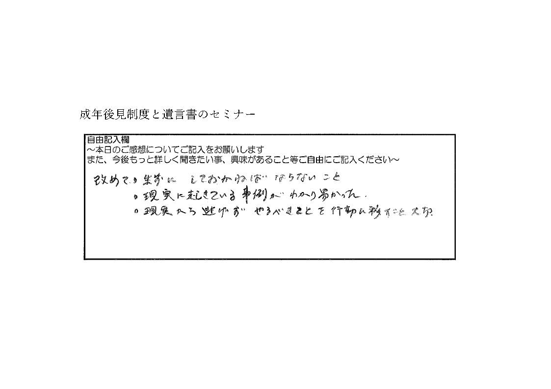 セミナーアンケート セミナーアンケートNo.2 2026.03.28 改めて・生前にしておかねばならないこと ・現実に起きている事例がわかり易かった ・現実から逃げずやるべきことを行動に移すこと大切 セミナーアンケートNo.1 前の記事