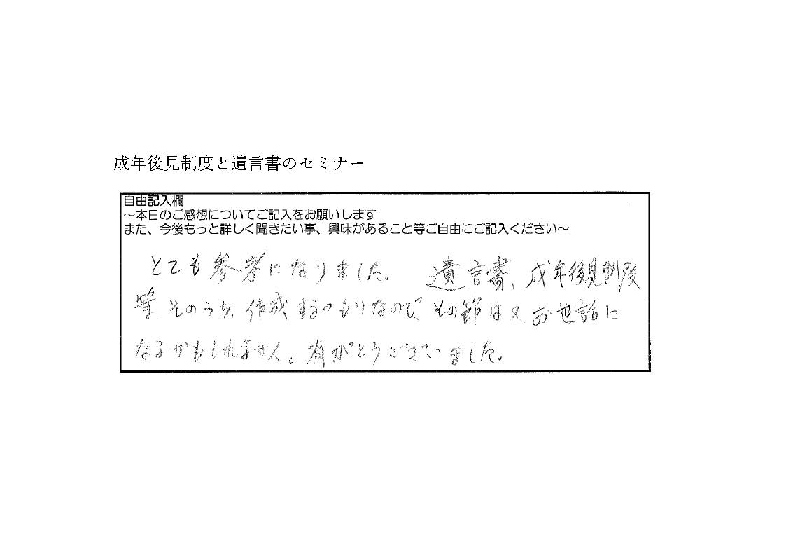 セミナーアンケート セミナーアンケートNo.7 2026.04.07 とても参考になりました。遺言書、成年後見制度 等そのうち、作成するつもりなので、 その節は又お世話になるかもしれません。 有がとうございました。 セミナーアンケートNo.6 前の記事