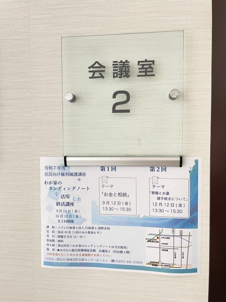 今回は全2回講座のうち、第1回目。 小田原市が発行している「わが家のエンディングノート」を活用して「お金と相続」をテーマにお話ししました。故人様の相続手続きにはどのくらいの種類とお金がかかるのか、支出の種類や受取ができるお金、締め切りのある手続きなどについて詳しくお話しました。不動産の名義変更、銀行の預貯金、有価証券、相続権の範囲については、今回も参加者の皆様からご質問も多く、関心の高さをうかがえました。また、生前の対策としては相続に備える為に相続財産の把握、税理士へのご相談や、遺言書を作成されるなど残された家族が困らない対策もご案内しました。