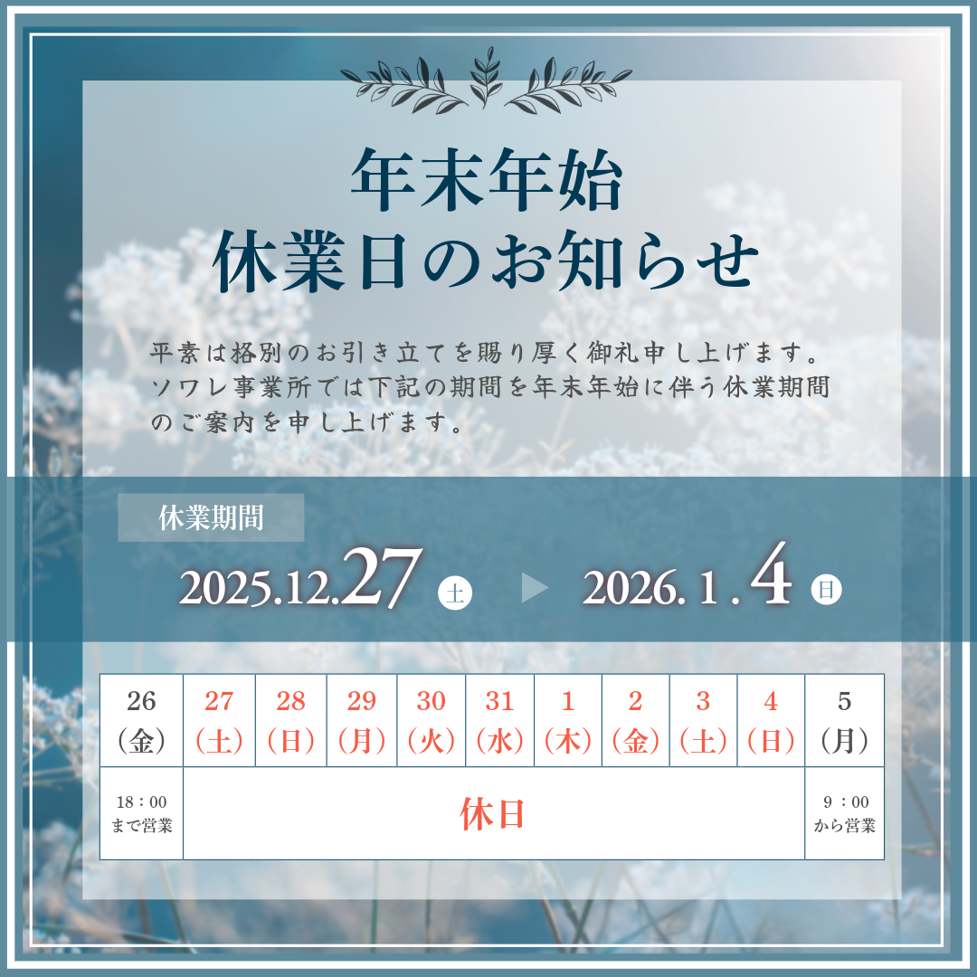 令和7年12月27日(土)から令和8年1月4日(日)まで年末年始お休みとさせていただきます。